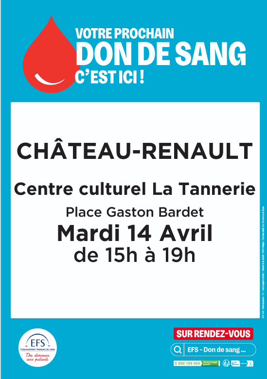 La prochaine collecte de sang aura lieu le mardi 14 avril 2026, de 15h à 19h à Château-Renault.