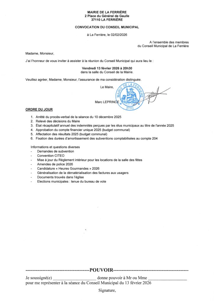 Le prochain conseil municipal aura lieu le vendredi 13 février 2026 à 20h30, salle du Conseil de la Mairie.